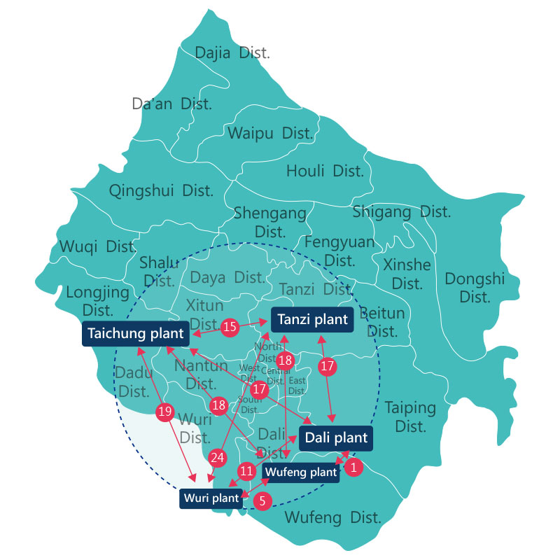 There are a total of 125 mixer trucks available for use within Central Taiwan plants.