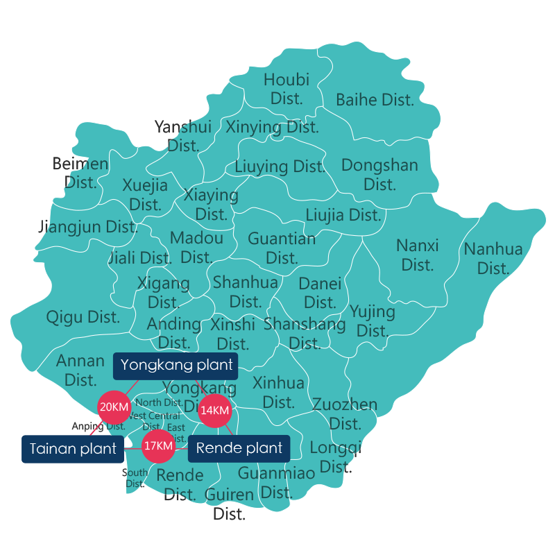 The refining process within the Tainan plant is of the highest standard and quality. There is a constant fleet of vehicles available for the transportation of products with access to multiple plant services.